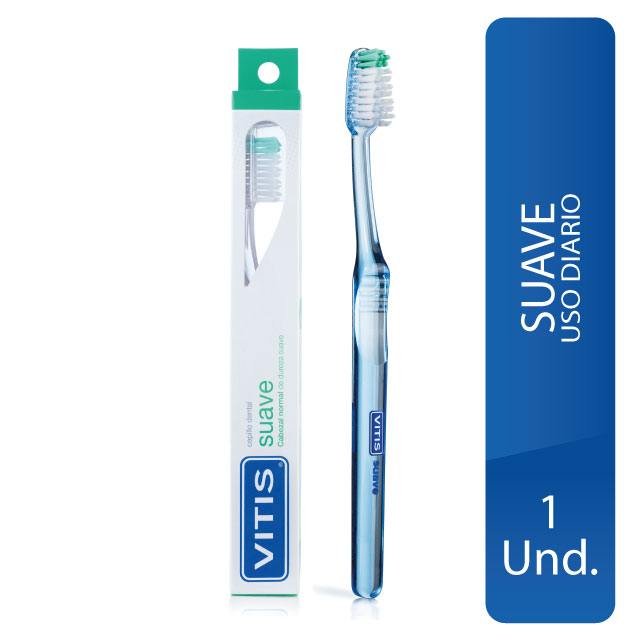 Vitis® suave es un cepillo de uso diario con un cabezal de forma diamantada que permite llegar a las zonas de difícil acceso de la cavidad bucal. Sus filamentos suaves y con perfil ondulado facilitan el acceso a los espacios interdentales y se adaptan a la forma de los dientes.El cuello del cepillo VITIS® suave es maleable de manera que se puede flexionar hasta adquirir la posición que mejor se adapta a la boca favoreciendo así la accesibilidad durante el cepillado.El mango es anatómico y con estrías antideslizamiento para facilitar el uso y comodidad durante el cepillado. Además posee un capuchón protector del cabezal que mantiene los filamentos agrupados y en condiciones óptimas de higiene.Vitis®suave es un cepillo dental con unos filamentos suaves diseñado especialmente para eliminar eficazmente el biofilm bucal (placa bacteriana).