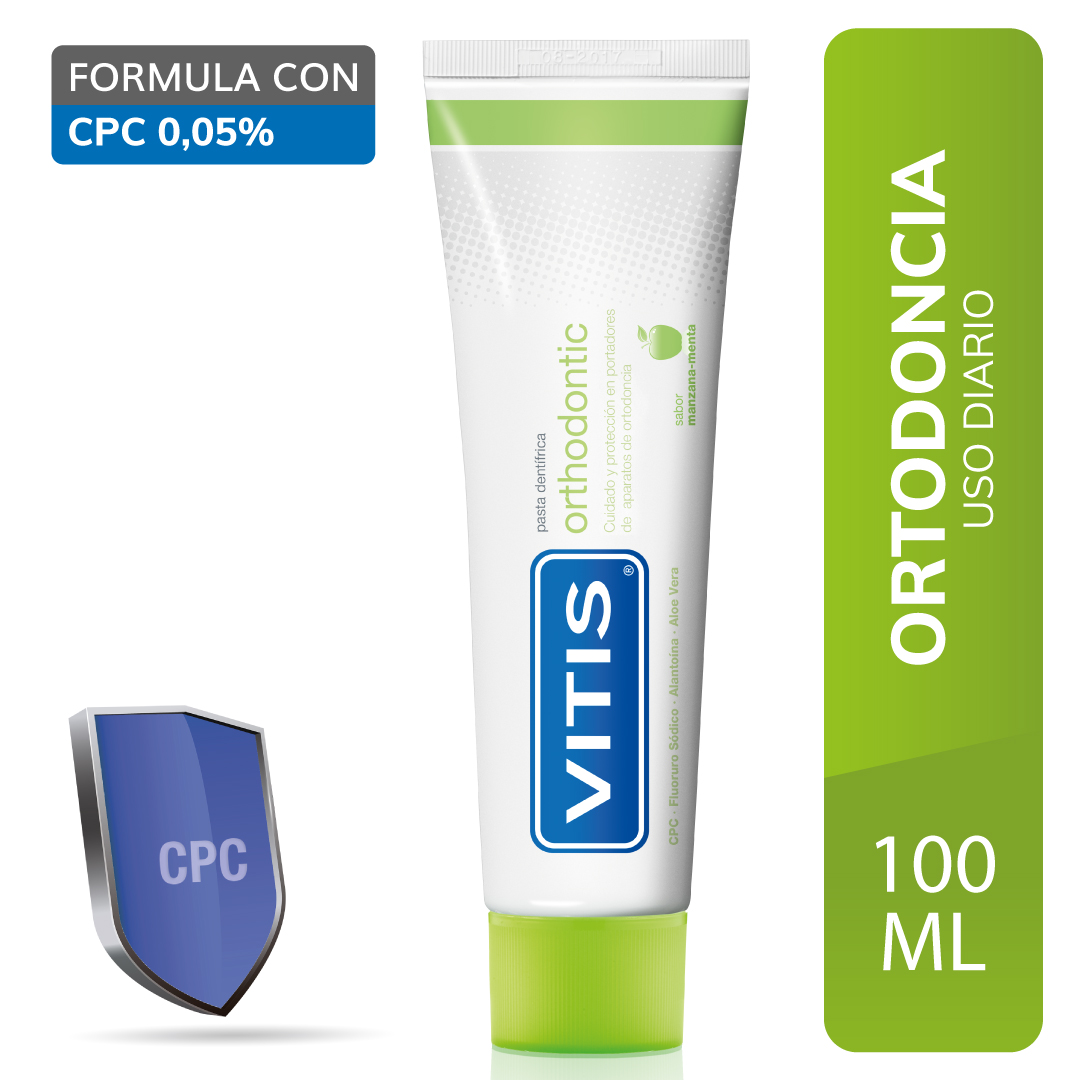 Cuenta con CPC (Cloruro de cetilpiridinio) al 0.05%. Vitis® Orthodontic ofrece una prevención diaria frente a problemas frecuentes derivados del tratamiento ortodóntico: heridas llagas acumulación de biofilm oral (placa bacteriana) etc. Así pues proporciona diariamente los principios activos necesarios para mantener una boca sana: inhibe la formación de biofilm oral protege la boca los dientes las encías y la mucosa oral a la vez que refuerza el esmalte y previene la caries dental. Su uso diario permite disfrutar de una boca limpia y sana durante el tratamiento ortodóntico. Tiene un agradable sabor a manzana-menta. Y además su innovadora textura favorece el rápido acceso entre los espacios de la ortodoncia.Vitis® orthodontic pasta dentífrica específicamente formulado para portadores de aparatos de ortodoncia. Cuenta con CPC (Cloruro de cetilpiridinio) al 0.05%. Puede ser utilizado desde los 6 años de edad con agradable sabor a menta